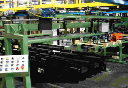 Die 3 Kufen werden gegriffen, angehoben, während der Fahrt zur Nagelmaschine per Servomotor auf Breitenposition gebracht und dann von oben sicher in die Montagemaschine eingelegt. Kein Umkippen der Kufen.