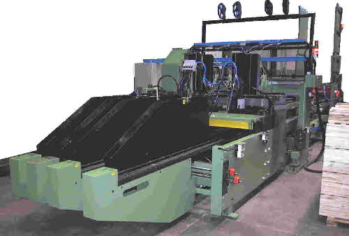 Hochleistungs-Heftmaschine mit motorisierter oder computergesteuerter Verstellung zur Herstellung von offenen oder geschlossenen Decks, Kistenelementen und 2-Wege-Paletten im Querdurchlauf, mit 1 oder 2 Deckbrettbreiten.